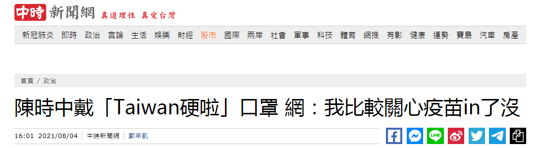 【環球網報道 記者趙友平】台灣“中時新聞網”消息,台灣地區流行疫情指揮中心今天(4日)下午召開防疫記者會,指揮官陳時中與防疫團隊都戴着中國台北隊羽毛球男雙運動員王齊麟、李洋奪得奧運金牌的決勝點的“文創口罩”,其中陳時中的口罩上更是寫上“Taiwan硬啦”字樣。目前台灣防疫相關物資尤其是疫苗的存量相當吃緊,台灣網友勸陳時中不要搞這些有的沒的,“民眾只要疫苗”,“採購疫苗拖拖拉拉,很多人拳頭早‘硬’了”。
