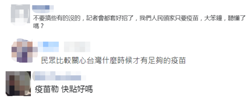 報道稱,該畫面也在島內引發網友討論。比起追時事梗,許多人還是認為好好搞好防疫比較實在,目前台灣疫苗數量嚴重不足,儘管疫苗已達到34%的覆蓋率,但是目前庫存所剩無幾,從外國訂購的疫苗也都尚未抵台,有網友直言,不要搞這些有的沒的,民眾只要疫苗,只關心台灣什麼時候有足夠的疫苗。↓