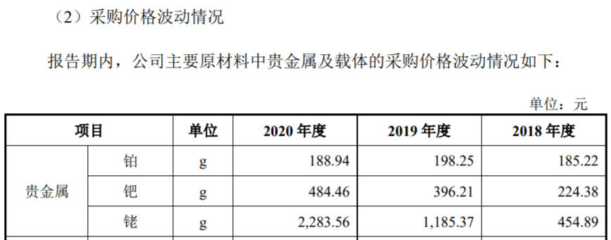 再來看中自環保的經營數據,根據招股書披露,中自環保的主營產品生產過程中需要鉑、鈀、銠等貴金屬,貴金屬的採購額佔到中自環保採購總額的比重高達87.31%、其中金屬鈀一項的採購佔比在2020年就高達50%以上,也是中自環保最重要的成本項目。