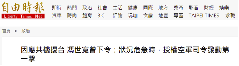 今日的《自由時報》聲稱,“共機”連續“侵擾”台灣空域,台灣空軍除公佈由F-16V戰機發射AIM-120導彈的視頻、展示捍衞防務安全的決心外,也多次討論戰機飛行員行使“自衞反擊權”的相關議題。報道援引台灣“軍聞社”同日的報道稱,馮世寬日前在該會發行的八月份《榮光雙週刊-大鵬隨筆》中,撰文緬懷去年因重大飛行安安事件殉職的前“參謀總長”沈一鳴,“軍聞社”在對馮世寬的訪談中,披露了馮世寬與沈一鳴之間的互動。
