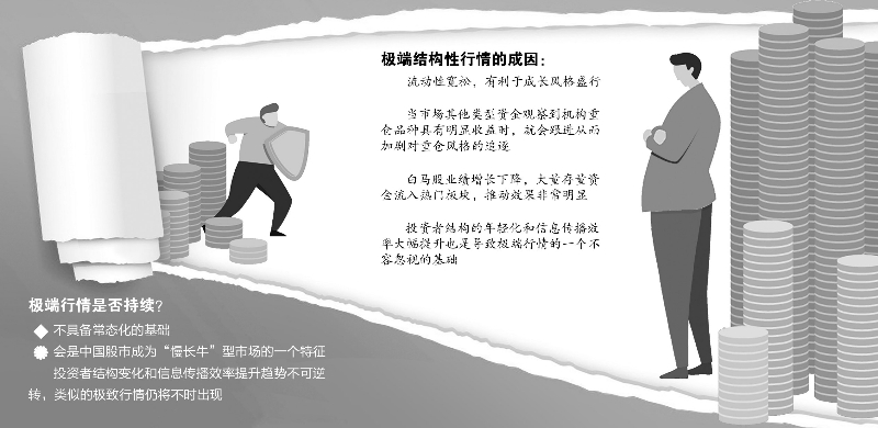 既然認定是極端行情,業內人士認為這種情況不具備常態化的基礎。不過,也有基金經理認為,結構性行情還將持續一段時間,也會是中國股市成為“慢長牛”型市場的一個特徵。