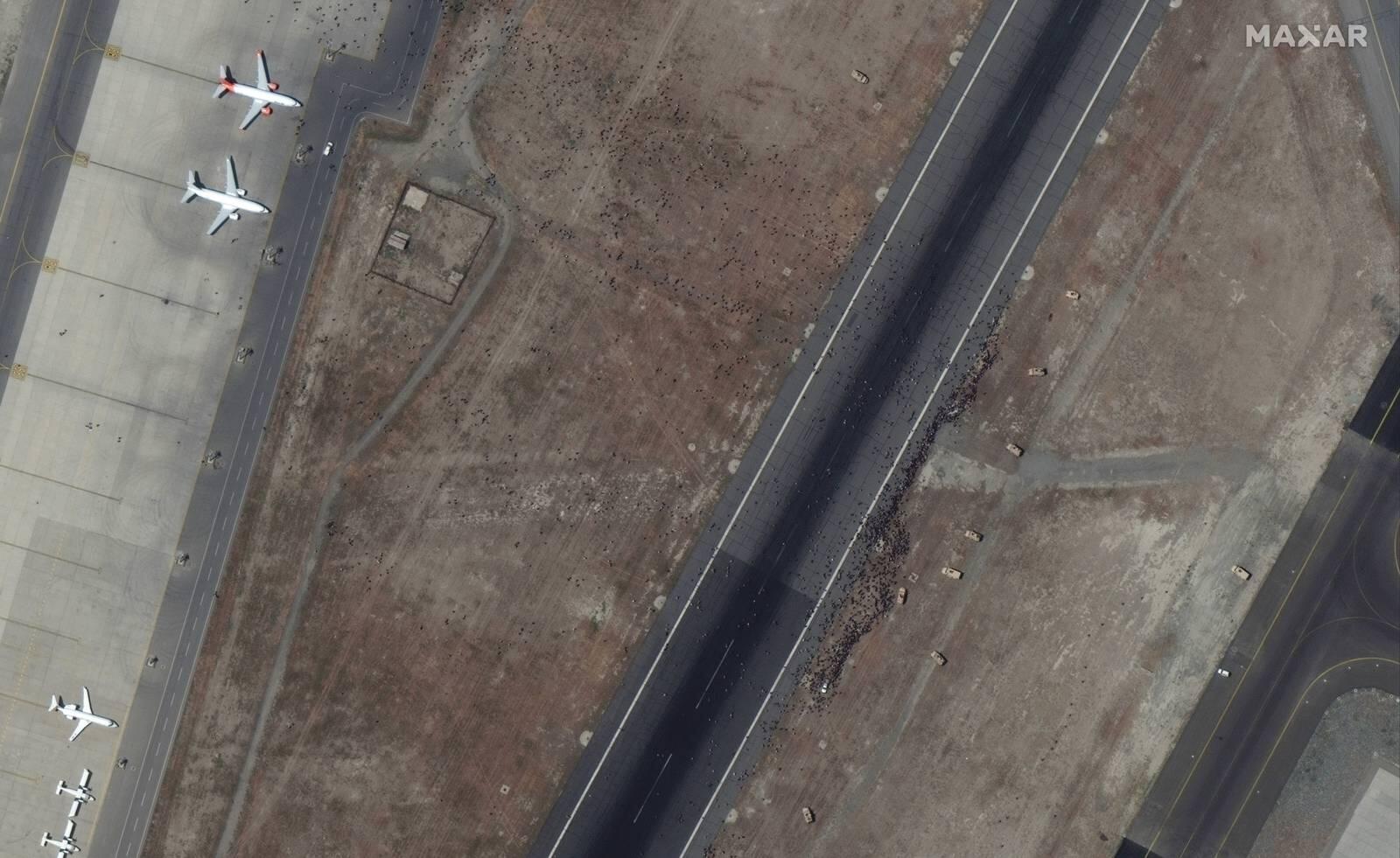 商業衞星公司Maxar Technologies公佈的最新衞星圖像顯示,在當地時間8月16日上午10點36分,停機坪上聚集着大量人員。該公司表示,當時一架土耳其客機正準備起飛,安保人員試圖阻止人羣進入停機坪。其他衞星圖則顯示人們在逃往喀布爾機場的時出現了交通堵塞,大批人羣聚集在停機坪和機場周圍。