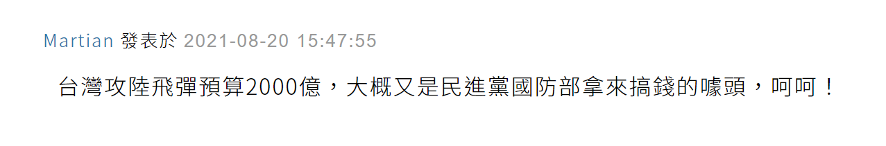 【環球網報道】島內綠媒21日以一種聳人聽聞的口氣宣稱,因應對大陸所謂“武力威脅”,強化“自主戰力”,台灣省防務部門規劃提出兩千餘億元新台幣的特別預算案,包括生產具有“源頭打擊”能力的飛彈等。對此,有島內網友直截了當諷刺稱,“大概又是民進黨‘國防部’拿來搞錢的噱頭,呵呵!”