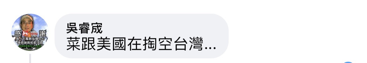 另有網友在臉書上批評説,“菜(蔡英文)跟美國在掏空台灣……”↓