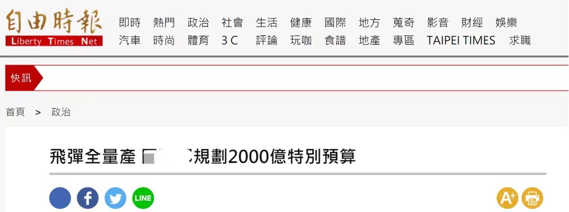 報道稱,為應對兩岸局勢變化,希望“中科院”各類型精準遠程飛彈能夠提前量產,台軍因此提出這項特別預算案。報道還介紹稱,這項所謂特別預算案名稱尚未確定,而其規模將達兩千餘億元新台幣,其重點將在於產製具有“源頭打擊”能力的飛彈和造艦經費,全案將送行政院審議,尚未核定。
