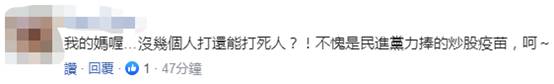 還有網友諷刺,“我的媽喔…沒幾個人打還能打死人?!不愧是民進黨力捧的炒股疫苗,呵~”↓
