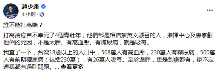 趙少康今天在臉書發文表示,打“高端”疫苗不幸死了4個青壯年,他們都是相信蔡英文號召的人,指揮中心及“專家”對他們的死因解釋為,不是太胖、有高血壓、有糖尿病,就是吸毒。趙少康稱自己查了一下,島內18歲以上的人口中,508萬人有高血壓,230萬人有糖尿病,500萬人有前期糖尿病(包括230萬),有26萬人吸毒。至於過胖,更是到處都有,“説不定連我都有過胖問題”。