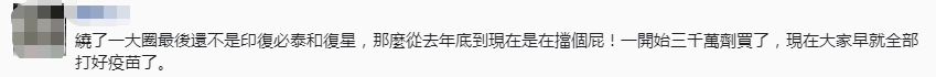 “繞了一大圈最後還不是印復必泰和復星,那麼從去年底到現在是在擋個屁!一開始三千萬劑買了,現在大家早就全部打好疫苗了。”