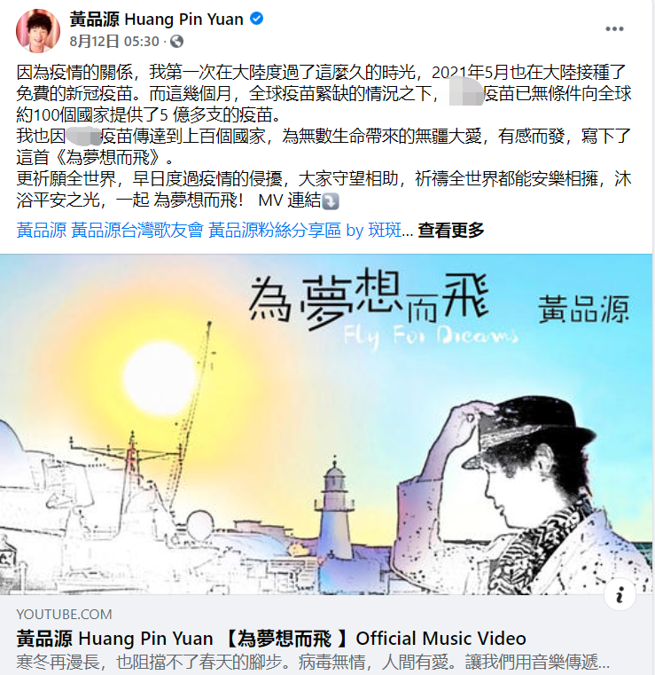中國台灣歌手黃品源寫歌讚頌大陸疫苗,竟然被綠媒圍攻