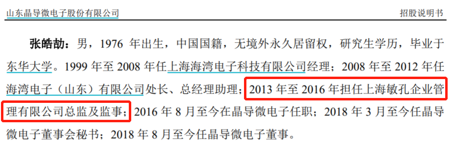 值得關注的是,晶導微的董事、董事會秘書張皓劼先生於2016年8月入職於晶導微,此前於2013年至2016年擔任上海敏孔企業管理有限公司總監及監事。但是根據《全國企業信用信息公示系統》查詢顯示,上海敏孔企業管理諮詢有限公司成立於2012年6月,截止到目前張皓劼先生仍然是該公司的監事,這也與晶導微的公開信息披露存在差異。