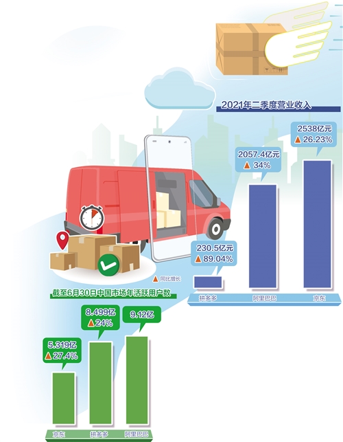 近日,京東、阿里巴巴、拼多多都已發佈2021年二季報。在我國疫情得到有效控制,經濟快速復甦的背景下,三家公司營收同比均實現增長,活躍用户數量穩步提升,電子商務在消費市場“穩定器”作用依然顯著。