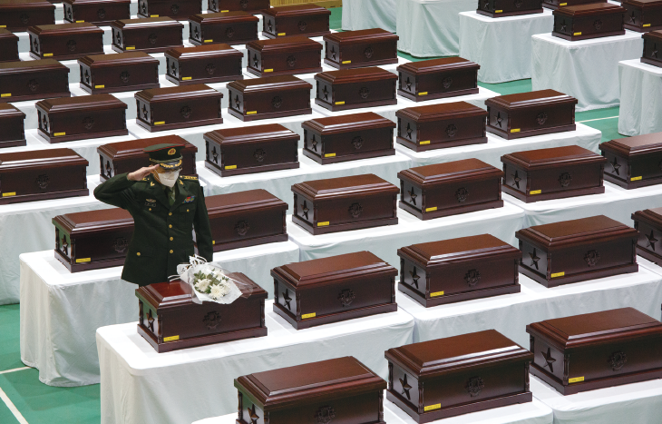 “煌煌烈士盡功臣,不滅光輝不朽身。”郭沫若在瀋陽北陵抗美援朝烈士陵園所題的詩句,道出多少年來國內人民對當年志願軍烈士的無限崇敬。一個國家對為國犧牲者的褒揚和紀念,又是對生者的激勵,也是弘揚愛國主義精神的重要體現。今年9月2日,中韓雙方舉行2014年以來的第八批在韓中國人民志願軍烈士遺骸交接儀式,接着在瀋陽舉行隆重的迎靈安葬儀式,紀念那些為保家衞國犧牲在異邦的烈士並迎接他們“回家”。