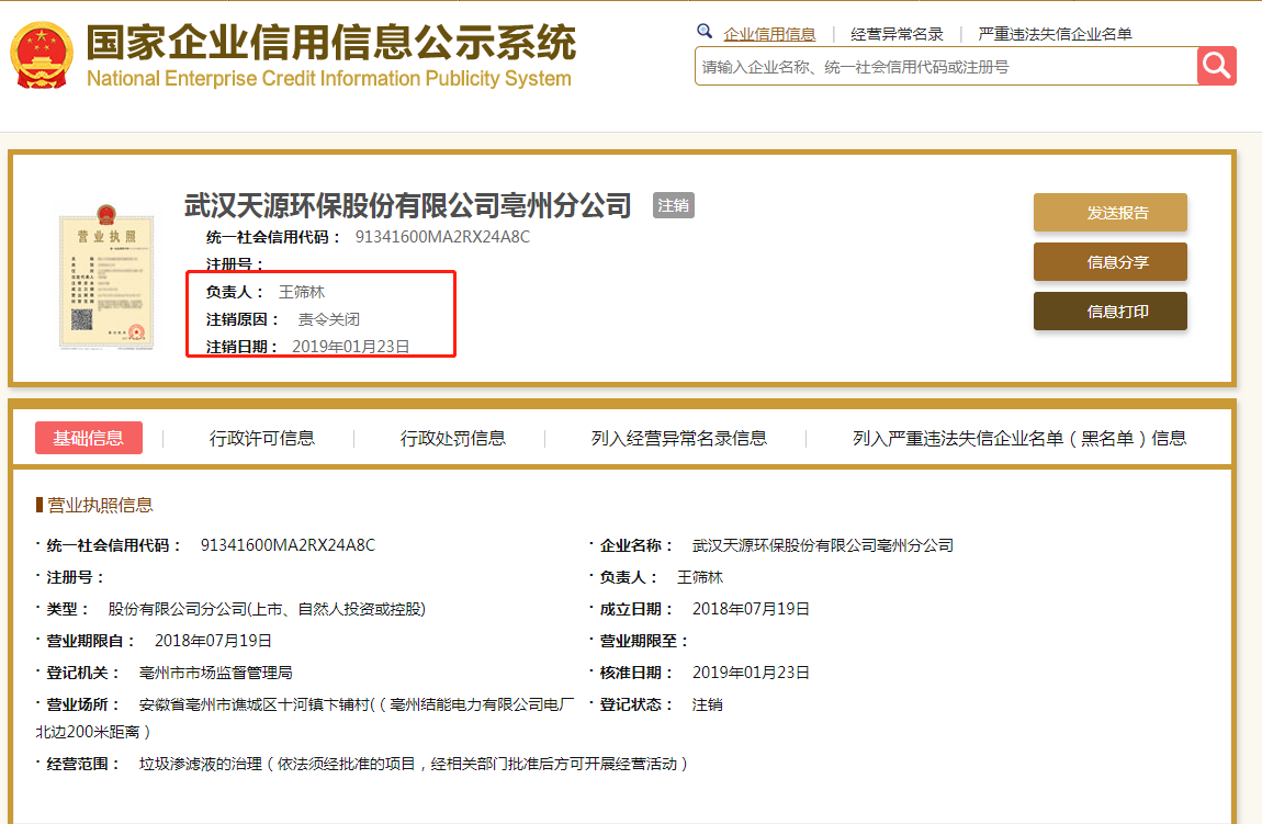 另外,武漢天源環保股份有限公司亳州分公司是天源環保的分支機構。國家企業信用信息公示系統顯示,該公司2019年1月23日被責令關閉。