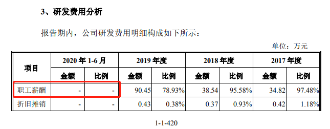 招股書進一步披露,研發人員薪酬與研發活動密切相關的設備折舊記入研發費用,但2020年1-6月,研發費中的職工薪酬為零,這並不符合正常的經營邏輯。對此,本網發函求證,但公司未予回應。