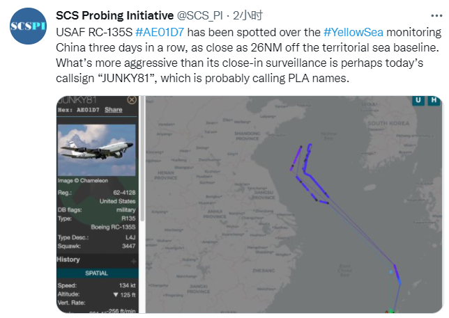 美軍導彈監視機被曝連續3天在黃海偵察,還在呼號上針對解放軍耍心機!