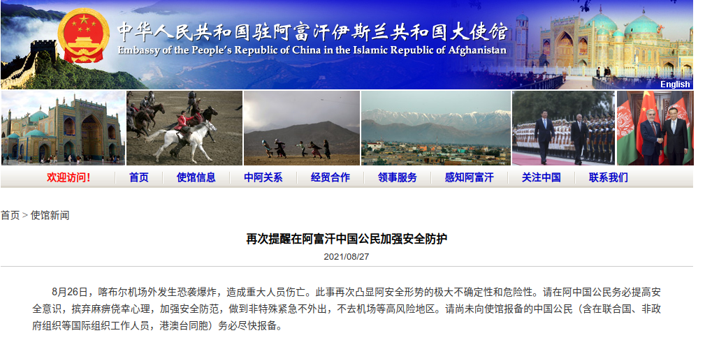 關於阿富汗的具體安全狀況,筆者注意到,中國外交部年內已連續四次發佈相關安全提醒,最近的兩次更是直接呼籲在阿中國公民儘早離境,並進一步強調:“如堅持留阿,將面臨極高安全風險,因此產生的一切後果由個人承擔”。駐阿富汗大使館最近一次的安全提醒也是發自8月27日,指明“阿安全形勢的極大不確定性和危險性”,提醒在阿中國公民務必“非特殊緊急不外出,不去機場等高風險地區”。