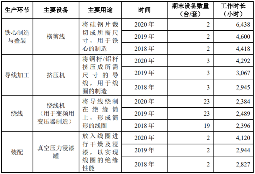 根據招股書披露的生產信息。新特電氣產品生產環節包括四個主要工序,分別為:鐵心製造與疊裝、導線加工、線圈繞制及壓裝、器身裝配。其中,繞線環節是公司產品生產過程中的關鍵工序,其製造質量會直接影響產品質量,線圈生產能力是公司產品總體產能的決定性因素。