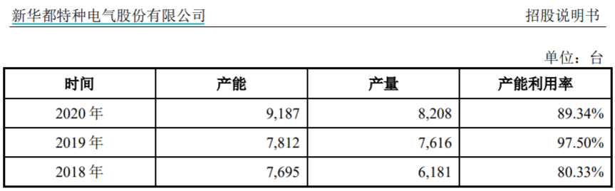 招股書也披露了新特電氣繞線環節對應的核心生產設備繞線機的保有數量,2019年淨增加了4台,從2018年的19台增加至23台;2020年則與2019年保持一致。但與此同時,招股書披露的新特電氣產能數據則顯示,2020年總產能為9187台,相比2019年的7812台大幅增加了10%以上。也即在2020年並未出現繞線機數量增長,且其他生產設備也未出現增長的背景下,產品總產能卻出現明顯增長。