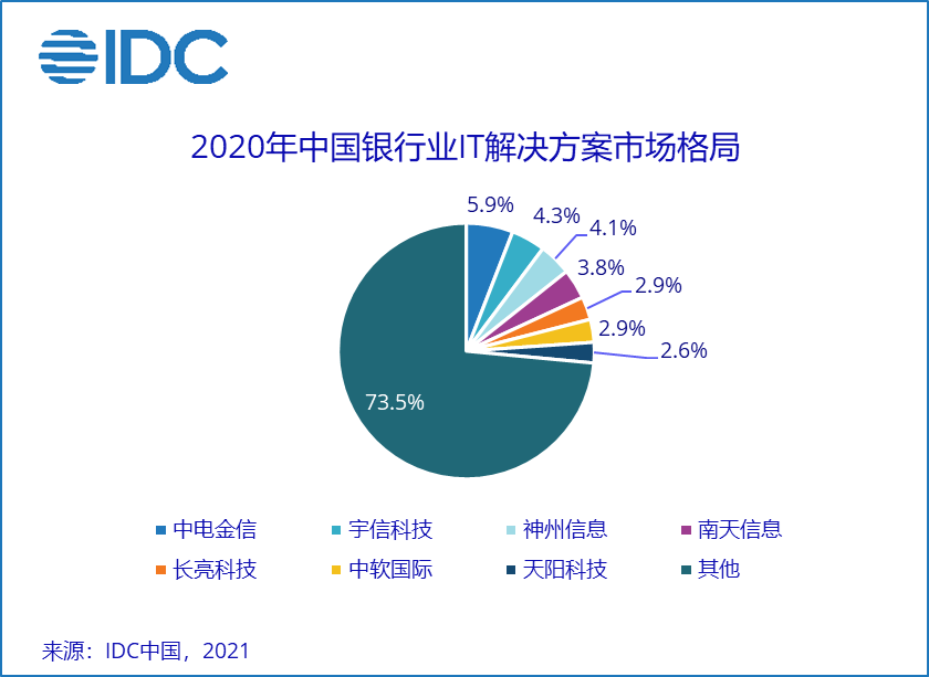 數據顯示,2020年中國銀行業IT解決方案市場的整體規模達到502.4億元,比2019年增長18.0%。IDC預測該市場2021年到2025年的年均複合增長率為14.64%,到2025年,中國銀行業IT解決方案市場規模將達到1185.6億元人民幣。從競爭格局看,中電金信、宇信科技、神州信息等廠商仍保持領先地位。