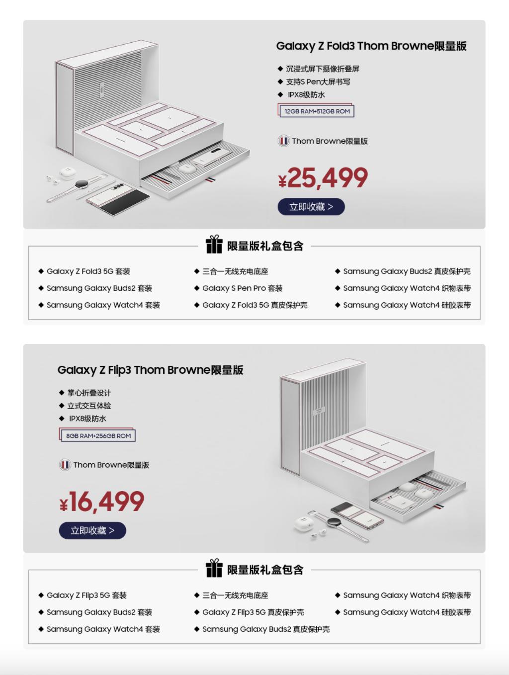三星新一代Thom Browne限量版的兩款套裝中,分別提供了三星Galaxy Z Fold3 5G Thom Browne限量版和Galaxy Z Flip3 5G Thom Browne限量版手機,以及與手機設計契合的三星Galaxy Watch4、Galaxy Buds2、真皮保護殼、錶帶等配件。