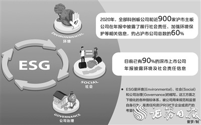 8月26日,上交所黨委副書記、總經理蔡建春在“ESG全球領導者峯會”上表示,2020年,全部科創板公司和近900家滬市主板公司在年報中披露了履行社會責任、加強環境保護等相關信息,約佔滬市公司總數的60%。9月6日,深交所理事長王建軍在第60屆世界交易所聯合會(WFE)會員大會暨年會上表示,目前已有90%的深市上市公司年報披露環境及社會責任信息。