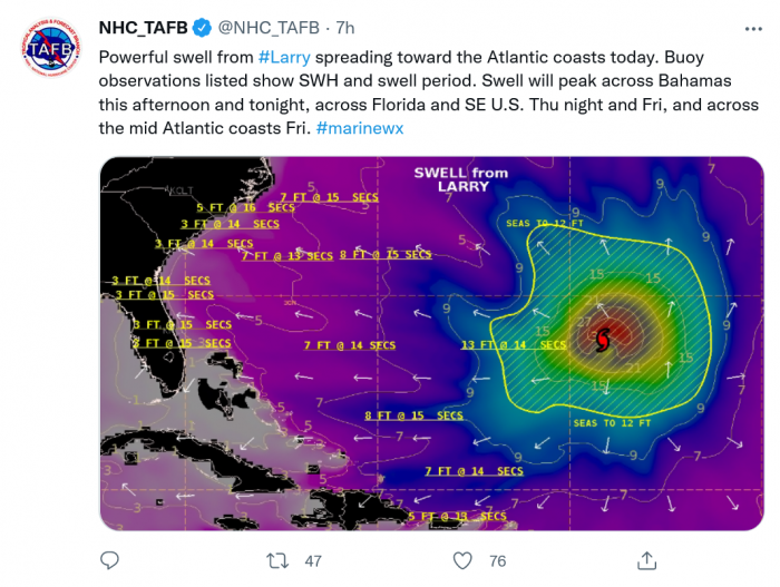 “拉里”產生的海浪可能會造成美國國家健康中心所説的“危及生命的衝浪和撕裂洋流狀況”。目前對拉里路徑的預測顯示它向東北方向移動,它將繞過美國海岸並經過加拿大紐芬蘭附近。