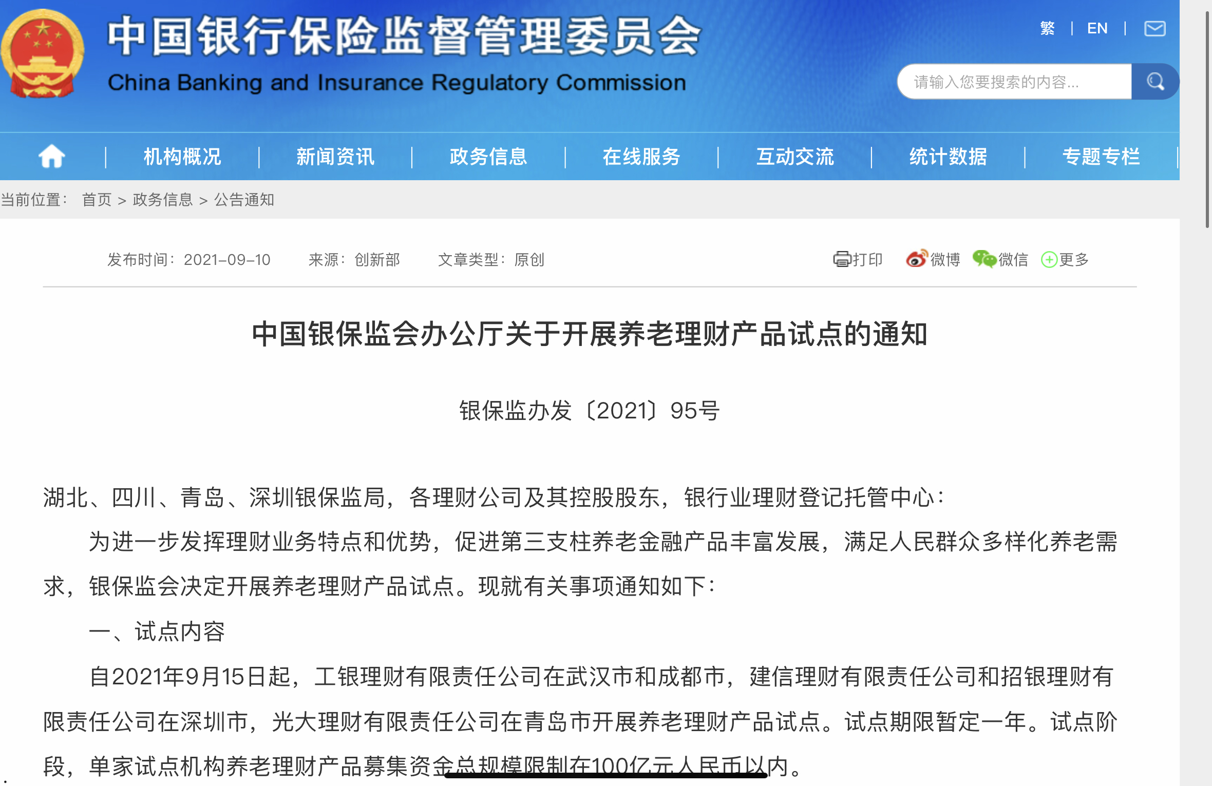 《通知》稱,自2021年9月15日起,工銀理財有限責任公司在武漢市和成都市,建信理財有限責任公司和招銀理財有限責任公司在深圳市,光大理財有限責任公司在青島市開展養老理財產品試點。試點期限暫定一年。試點階段,單家試點機構養老理財產品募集資金總規模限制在100億元人民幣以內。