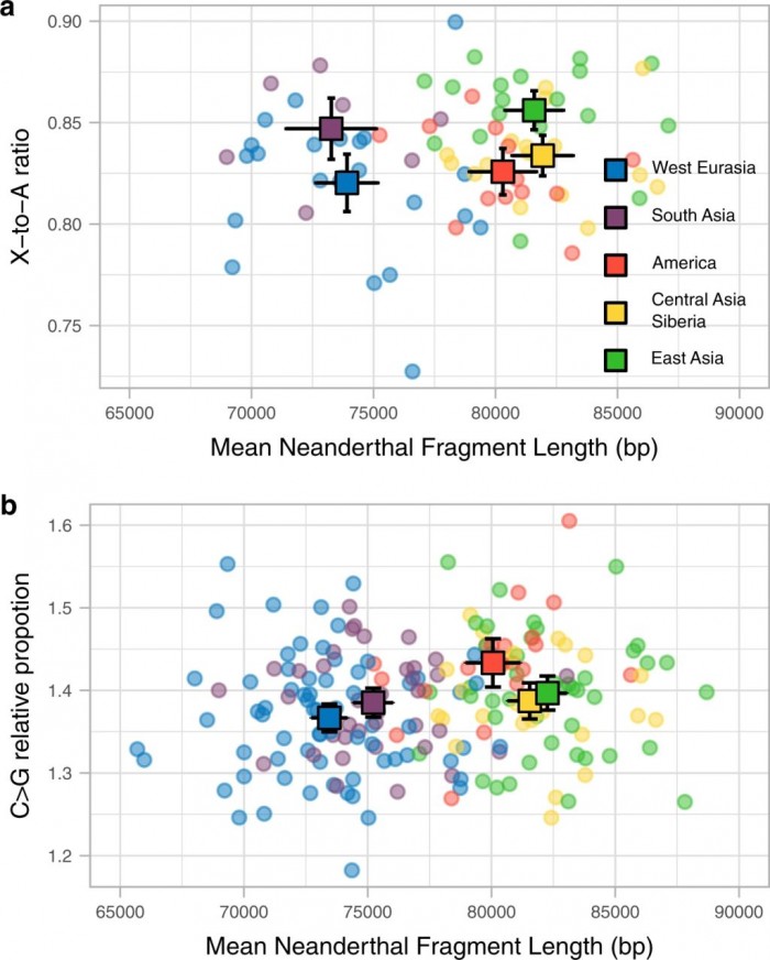 使用非洲基因組以外的尼安德特人片段作為分子鐘/基因鍾,來自丹麥奧胡斯大學和德國馬克斯·普朗克進化人類學研究所的科研團隊對歐亞和美洲人羣的世代間隔進行了預估。