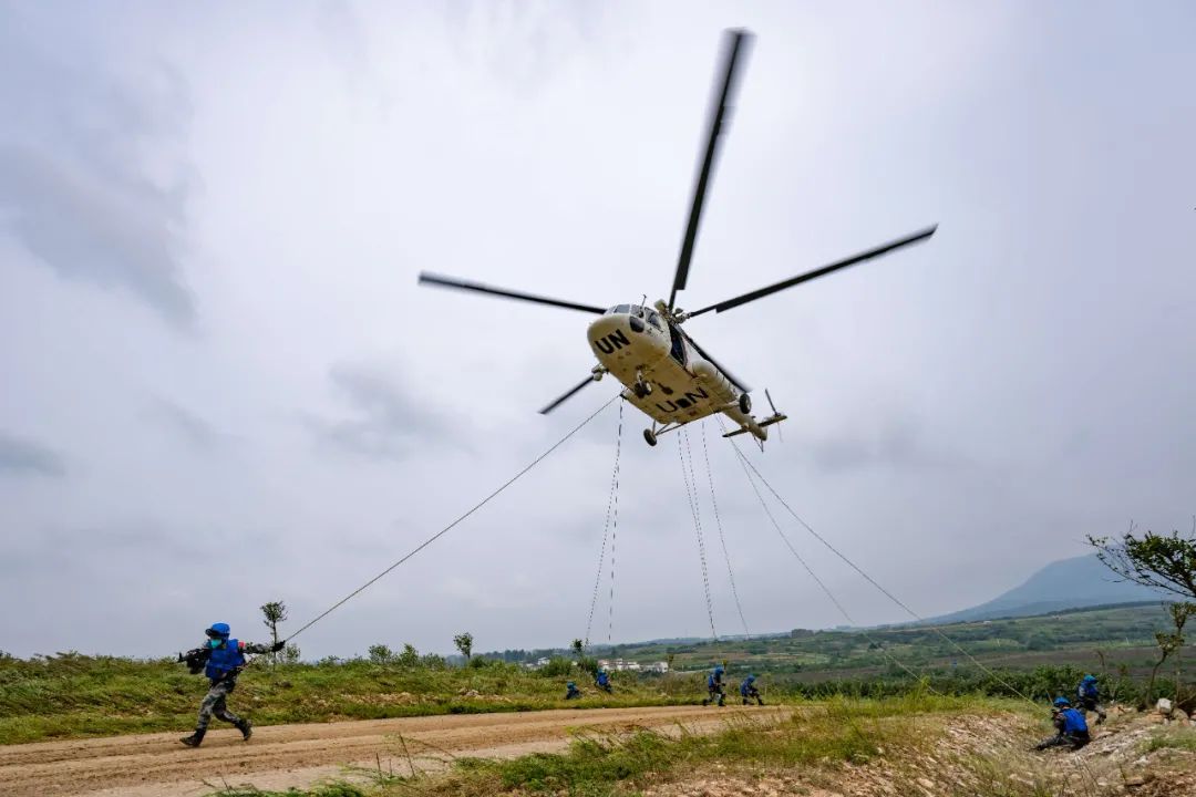 從天而降,快速作戰。人民陸軍融媒體記者看到,快反隊員在機降後分兩組沿道路交替前進,迅速佔領有利地形,採取遠近結合、交替掩護的方式,協同其他分隊對“武裝分子”展開火力打擊。