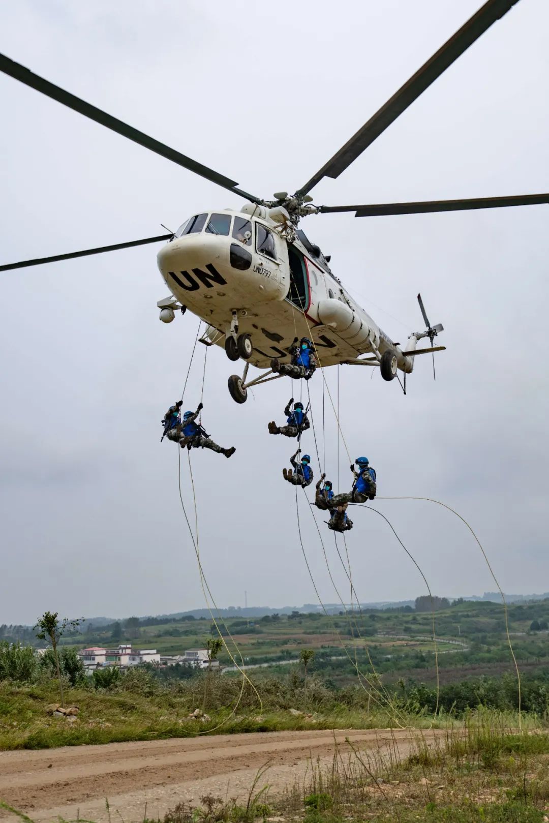 鐵翼飛旋,勁風呼嘯。循着巨大的發動機轟鳴聲望去,一架直升機正懸停空中,8名快反隊員同時從直升機尾艙、側艙、艙腹躍出,順着8條繩索,快速降落地面……