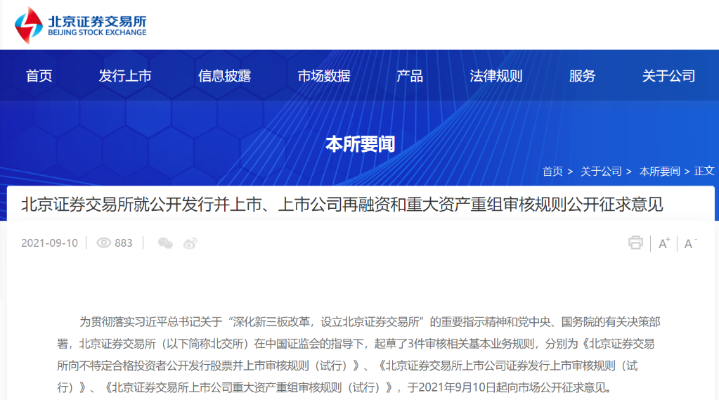 10日,北京證券交易所就公開發行並上市、上市公司再融資和重大資產重組審核規則公開徵求意見。