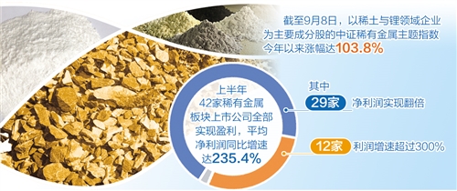 近幾個月,A股稀有金屬板塊呈現上漲行情。截至9月8日,以稀土與鋰領域企業為主要成分股的中證稀有金屬主題指數今年以來漲幅已達103.8%。