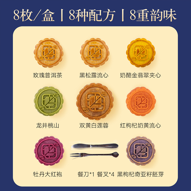 比如,中藥老字號同仁堂今年就推出了“東方韻味·國風月餅” 一盒八枚共計八種口味:玫瑰普洱茶、黑松露流心、奶酪金翡翠夾心、龍井桃山、雙黃白蓮蓉、紅枸杞奶黃流心、牡丹大紅袍、黑枸杞奇亞籽胚芽。