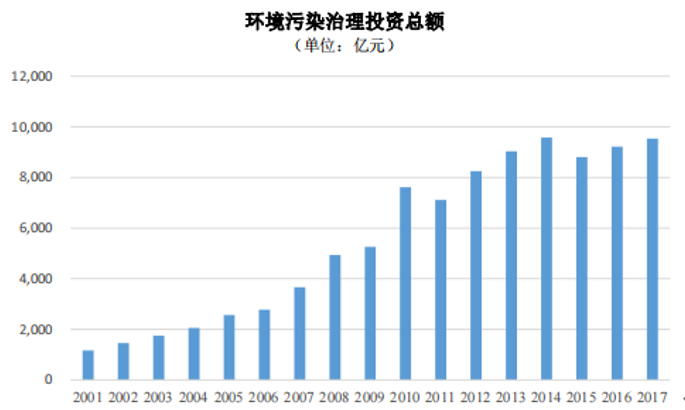 隨着國民經濟的持續發展、人均收入的不斷增長和民眾對環境保護意識的不斷提升,我國政府逐漸加強環境保護力度,鼓勵在環境污染治理領域的投資,國家統計局和環保部及其他有關部委共同編制的《中國環境統計年鑑-2018》顯示,2017年全國環境污染治理投資總額已達到 9,539 億元,2001 年至 2017 年期間,全國環境污染治理投資總額持續快速增長,年複合增長率達到 14.03%。