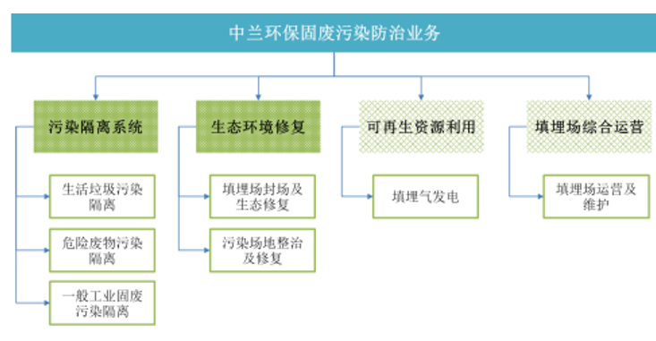 中蘭環保自 2001 年開始從事固廢污染隔離系統業務,是國內最早從事固廢污染隔離系統業務的企業之一。依託污染隔離系統業務領域的競爭優勢,公司成功拓展了生態環境修復、可再生資源利用、填埋場綜合運營等業務領域,實現了固廢填埋場“隔離、修復、資源利用、運營”等全產業鏈覆蓋,形成了圍繞固廢填埋場的綜合服務能力,廣泛應用於市政公用、能源化工、礦產資源等行業。