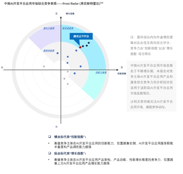 9月13日,全球知名市場調研機構弗若斯特沙利文及頭豹研究院聯合發佈中國AI系列報告之《2021年中國AI開發平台市場報告》(下稱“報告”),其中,騰訊雲TI平台憑藉突出的技術能力和創新指數,在中國AI開發平台應用市場綜合競爭表現中位居領導者象限,這意味着在國內AI開發平台位於第一梯隊的騰訊雲,實力再次獲得市場認可。