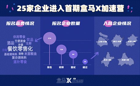 從6月開放報名至7月26日報名截止,首期盒馬X加速營共收集到216家企業,超過300餘件產品報名本期加速營。涉及品類包括餐飲零售化、寵物、複合調味料、酒品、生鮮、休閒零食、飲品、滋補零食等15個領域。其中包括了味全、百事、西貝等知名大牌;也有鯊魚菲特、勁面堂等資本寵兒。
