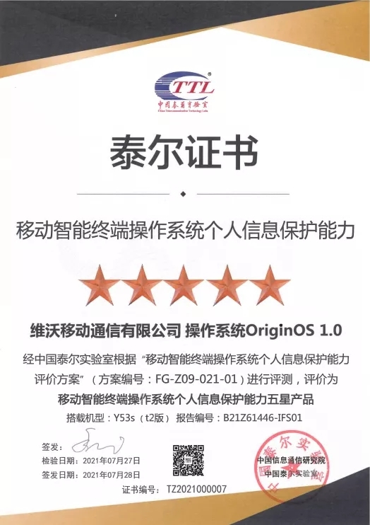 OriginOS獲中國泰爾實驗室面向移動智能終端終端操作系統首張個人信息保護能力證書