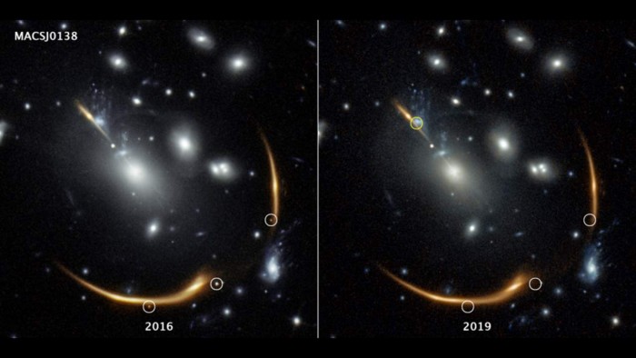 這顆超新星的背後是一個名為MACS J0138的巨大星系團。這個巨大的星系團有足夠的引力來彎曲和放大來自超新星的光線,該超新星位於該星系團後面很遠的一個星系中。來自大質量星系團的引力透鏡將來自超新星的光線分割成多個鏡像,這些鏡像在上圖中被白色的圓圈所突出。