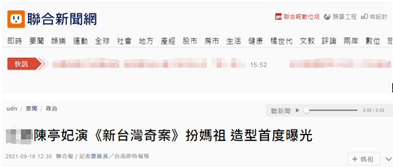 【環球網報道記者 康博浩】據《聯合報》和“ETtoday新聞雲”等台媒消息,台灣電視劇《新台灣奇案》日前在台南開拍,該劇邀請民進黨“立委”陳亭妃扮演劇中第2單元故事中的“媽祖”一角,由其扮演的媽祖形象於今天(16日)首次曝光。對此,有島內網友質疑,一貫“去中國化”的民進黨,竟然現在要演中國神?還有網友諷刺,“妖孽假扮真神原來是真有其事!”