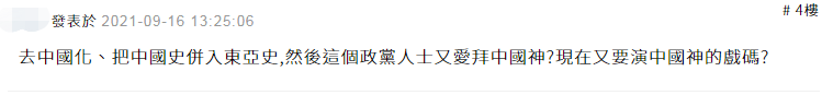 有網友就質疑:“去中國化”、把中國史併入東亞史,,然後這個政黨(指民進黨)人士又愛拜中國神?現在又要演中國神的戲嗎?↓