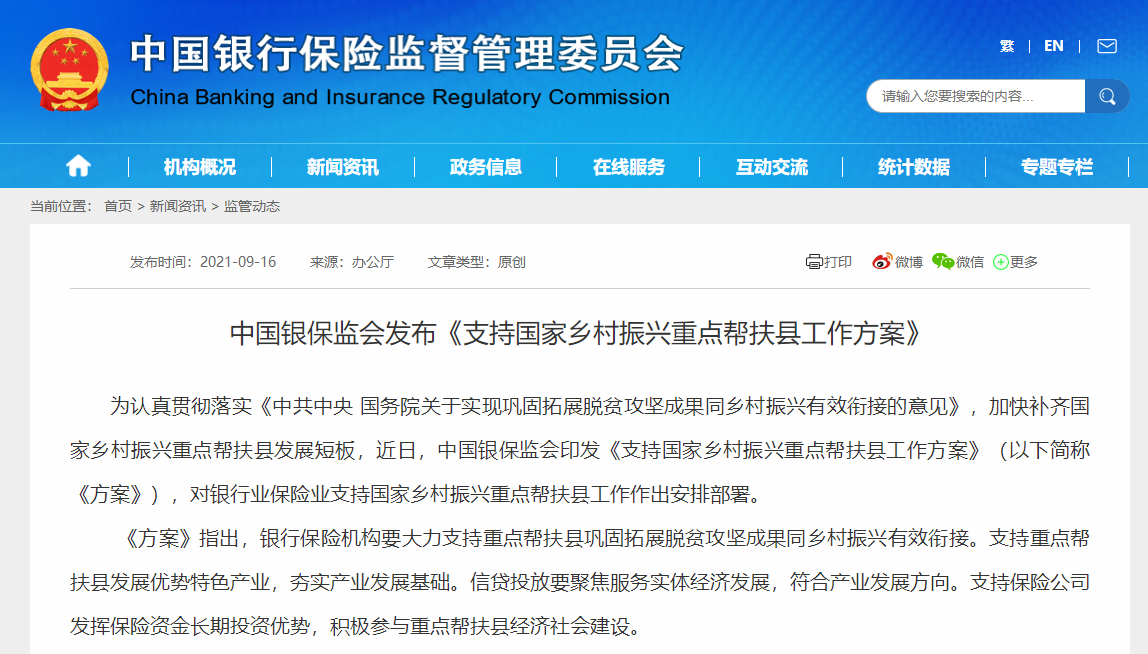 【環球網綜合報道】9月16日,銀保監會發布《支持國家鄉村振興重點幫扶縣工作方案》(以下簡稱《方案》),對銀行業保險業支持國家鄉村振興重點幫扶縣工作作出安排部署。