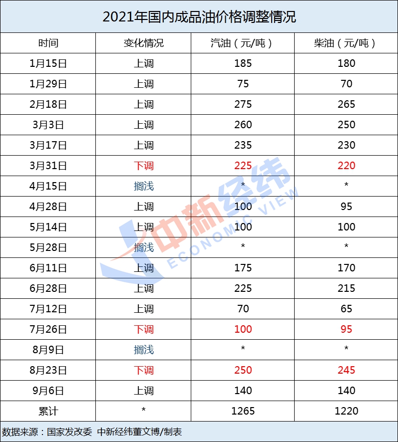 據中新經緯梳理,今年以來,國內成品油價格已進行了十七輪調整,呈現“十一漲三跌三擱淺”的格局,汽油價格累計上調了1265元/噸,柴油價格累計上調了1220元/噸。如果本輪上調預期兑現,將為年內油價第十二次上調。