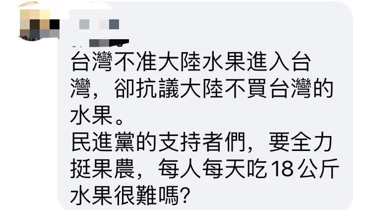 還有網友滿是諷刺意味地提問:“民進黨的支持者們,要全力挺果農,每人每天吃18公斤水果很難嗎?”↓