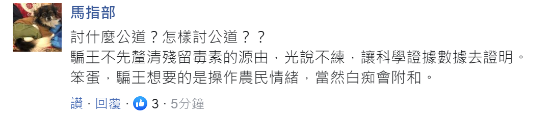 有網友反問“騙王”蔡英文:“討什麼公道?怎麼討公道??騙王不限釐清殘留毒素的源由,光説不練,讓科學證據數據去證明。”↓