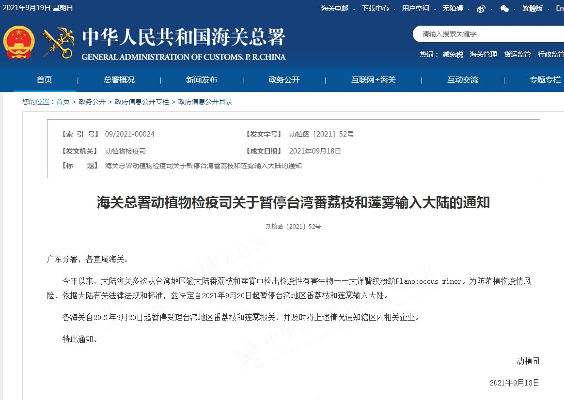 海關總署今日發佈通知表示,今年以來,大陸海關多次從台灣地區輸大陸番荔枝和蓮霧中檢出檢疫性有害生物——大洋臀紋粉蚧Planococcus minor。為防範植物疫情風險,依據大陸有關法律法規和標準,決定自2021年9月20日起暫停台灣地區番荔枝和蓮霧輸入大陸。各海關自9月20日起暫停受理台灣地區番荔枝和蓮霧報關,並及時將上述情況通知轄區內相關企業。