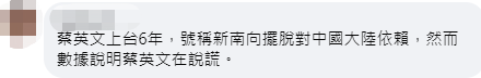 有網友看到“農委會”公佈的數據稱,“蔡英文上台6年,號稱新南向擺脱對中國大陸依賴,然而數據説明蔡英文在説謊。”“原來過去一直幫台灣農民的是大陸哦。”
