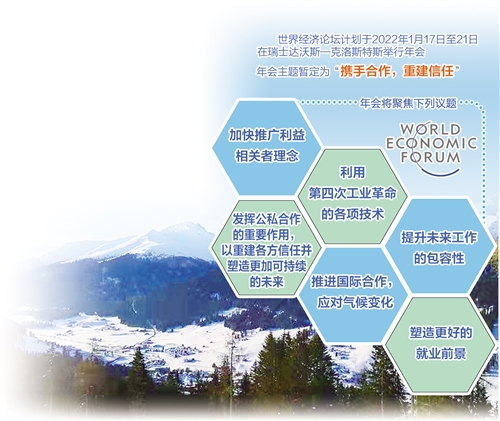 新聞通報説,世界經濟論壇計劃於2022年1月17日至21日在瑞士達沃斯—克洛斯特斯舉行年會。本屆年會主題暫定為“攜手合作,重建信任”。屆時,商界、政界和社會組織等全球各界領袖將齊聚達沃斯,共同商討受新冠肺炎疫情影響而不斷加劇的經濟、環境、政治和社會斷層問題。