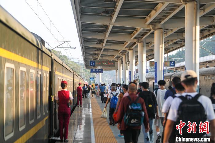 圖為江西贛州站,旅客從站台上走過準備上車。 劉力鑫 攝