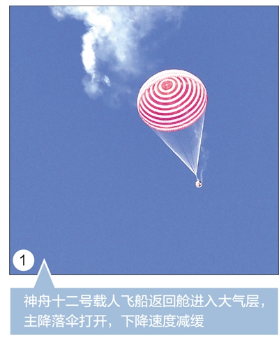 當距離地面40公里左右的高度時,飛船已經基本脱離“黑障區”,當它繼續減速直到距離地面10公里左右時,返回艙上的靜壓高度控制器通過測量大氣壓力來判斷所處高度,並先後打開引導傘、減速傘和主傘,以此保證返回艙以較為柔和的方式實現多次減速。